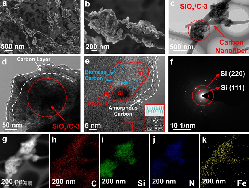 图1. Fe-N-C/SiOx/C-3的 (a, b) SEM图像;(c, d) TEM图像;(e) HRTEM图像;(f) SAED图案;(g) HAADF-STEM图像;(h-k) EDS图像。