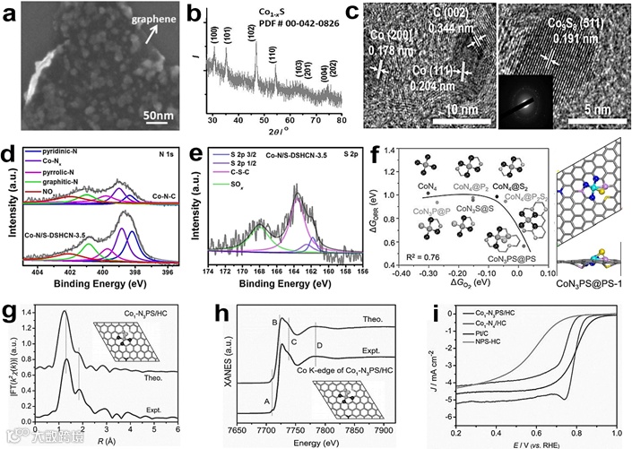 由于Co具有较弱的芬顿活性,相较于Fe,Co作为活性中心有助于提高催化剂的稳定性。在近几年的研究中发现,以Co作为活性位点中心的催化剂通常为Co-N-C型,具体的位点构型有CoN4/C, Co2N5/C等。通过将杂原子S、P等掺杂进材料中,以形成具有S、P配位的活性位点,如Co9S8,Co-N3PS位点等,这些策略均有助于提升催化剂的催化活性。