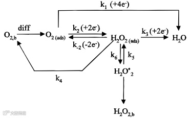 ORR反应路径可分为两电子路径和四电子路径,但两电子路径会产生副产物过氧化氢,因此四电子路径对于氧还原反应研究较广泛。对于双金属催化剂,其反应路径可大致分为路径A,路径B和路径C(如下图所示)。不同反应路径对应着不同的吸附模型,造成了不同的催化性能。