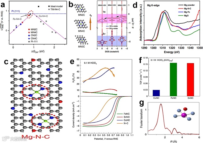 除了上述提及的两种过渡金属Fe,Co外,其余过渡金属如Mn、Cr等形成的催化剂也被研究,其活性位点大多为M-N4-C(M=Mn、Cr)型结构。除了过渡金属外,主族的金属如Mg、Sn也被用于氧还原反应的研究。形成的单原子M-N-C型催化剂均显示出了良好的ORR催化性能。