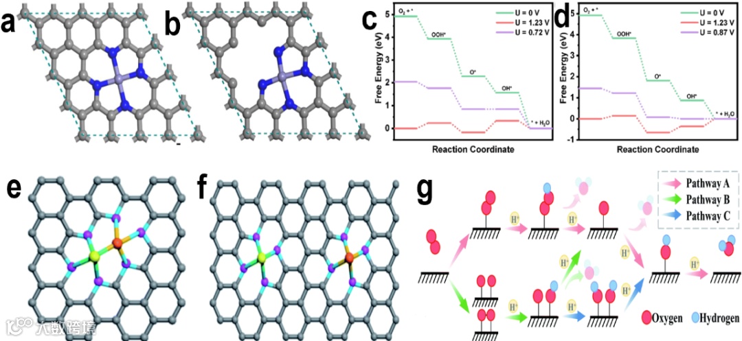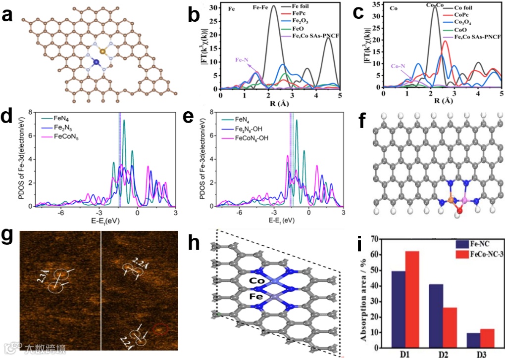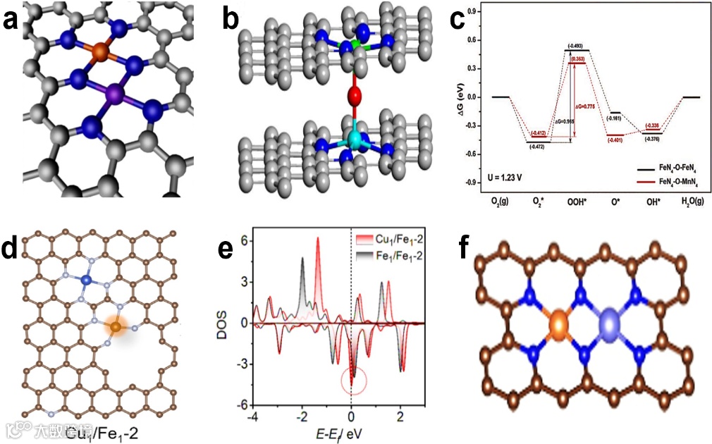通过引入双金属,金属之间的协同催化作用可以调节活性位点的电子结构,进一步提高ORR的性能。受此启发,设计和合成双金属位催化剂引起了人们的极大兴趣。理论研究表明,引入第二种金属可以有效的提升催化剂的性能,但不同的活性位点结构也会对催化剂性能造成很大的影响,如FeCoN6 的催化活性就低于 FeCoN7 和 FeCoN8的。双金属催化剂可分为两种主要类型:一种是活性部分由两种具有不同中心金属的活性位点的简单叠加组成,因为这两种金属相距足够远,它们没有键合。另一种是两个金属原子闭合形成键并产生电子相互作用,这可以促进本征催化活性。因此活性位点的类型可分为两大类,如两种金属位点的叠加:Co2N6和FeN4所形成的Co2/Fe-N@CHC催化剂;以及金属Fe与Co协同形成的催化剂,如N3-Fe-Co-N3,FeCoN5-OH型的活性位点。