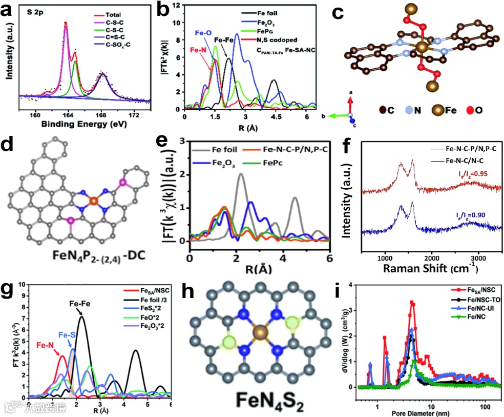 根据火山型曲线,Fe是最具ORR催化潜力的过渡金属。经过近几年的研究与发展,以Fe为活性位点中心的催化剂活性位点类型大致可分为Fe碳化物(Fe3C),金属Fe纳米微粒,Fe氧化物(Fe2O3)以及Fe-N-C型催化剂。除此之外,通过引入其他杂原子掺杂,可形成具有不同配位结构的Fe-N-C位点,如FeN4P2位点等。实验证明,活性位点的构型对催化剂催化活性具有较大影响,而具有Fe-N-C的催化剂表现出较高的催化活性。