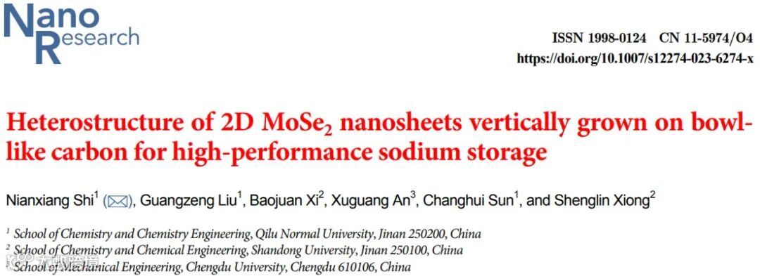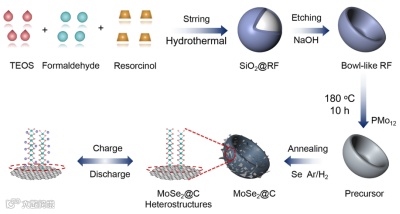 能源危机和环境挑战促使二次电池迅速发展。其中,锂离子电池因其高容量、长循环寿命和无记忆效应而成为一个重要的发展方向,但金属锂储量有限增加了电池的生产成本。与锂离子电池相比,钠离子电池有资源丰富、价格低廉、电化学机理相似等优势,有望取代锂离子电池。但在循环过程中,较大的Na+半径导致反应动力学迟缓,电极材料粉碎,可逆性差。因此,有必要设计和构建具有合适层间距和形貌的先进钠离子电池负极材料,以提高电池的能量密度和循环稳定性。MoSe2独特的二维结构和较大的层间距(6.4 Å),窄带隙(约1.1 eV)和高的理论容量(422 mAh g−1),成为钠离子电池的极具潜力的负极材料。然而,电子导电性低导致电化学性能较差,以及表面能过高导致结构堆积问题,使电化学性能难以提高。目前,人们已开发了一系列策略改善上述问题,但无论那一种方法都离不开碳,碳不仅可以提高电导率,还可以防止MoSe2团聚。空心碳结构具有提高电子传输及缓解体积变化的优点,但材料中存在较大的空隙会降低电池的能量和功率密度。因此,在保持碳空心结构优势的同时,提高电池的能量密度是非常有意义的。耦合不同相组分构建异质结构可以调节电子结构,并在异质界面处形成内部电场,从而加速电荷转移,提高反应动力学。