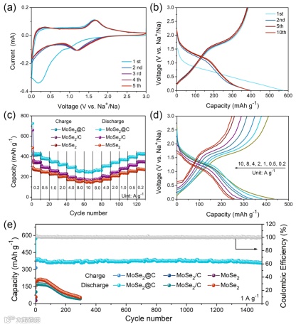 本团队采用模板法结合硒化处理,设计并制备了在碗状碳上垂直生长MoSe2纳米片的异质结构(MoSe2@C),用于提高存储钠的性能。这种独特的三维异质结构具有一系列的优点:(1)与球形结构相比,碗状中空结构不仅减轻了体积变化,而且增加了单位体积中活性物质的量。(2)异质界面处的内置电场加速了电荷的传递,提高了反应动力学和电化学性能。(3)MoSe2垂直生长在碗状碳的表面可以为吸附Na+提供更多活性位点。缓解充放电过程中的体积膨胀。当用作钠离子电池负极材料时,碗状MoSe2@C表现出了良好的循环性能(在1 A g−1的电流密度下循环1500次后容量保持在356.8 mAh g−1)和倍率性能(10 A g−1的电流密度下,容量可达249.9 mAh g−1)。该工作为构建特殊的空心异质结构提供了一条途径,提高了MoSe2纳米片在不同领域的应用潜力。