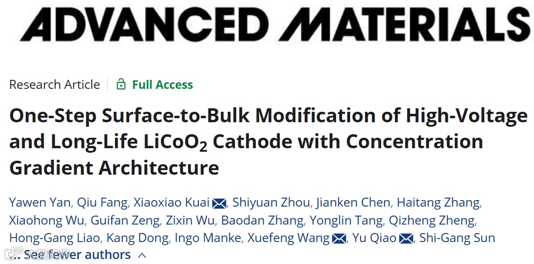 近日,来自厦门大学的乔羽教授、蒯笑笑博士与中科院物理所的王雪锋特聘研究员合作,在国际知名期刊Advanced Materials上发表题为“One-Step Surface-to-Bulk Modification of High-Voltage and Long-Life LiCoO2 Cathode with Concentration Gradient Architecture”的研究文章。该文章报道了一种利用高价元素(Nb5+)通过一步煅烧法实现多功能改性效果的策略,以稳定钴酸锂由表及里的高压不稳定性问题。