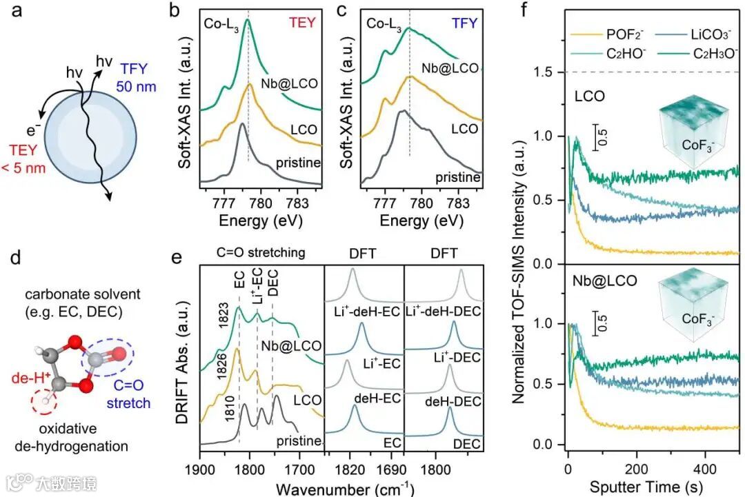作者利用TEY、TFY 模式的soft-XAS 来研究梯度Nb构型对Co redox分布的影响,发现充电到4.6 V高压时,LCO和 Nb@LCO的体相Co价态一致,说明Nb掺杂并未影响体相Co的氧化还原活性,而Nb@LCO由于存在Nb5+梯度构型(外表富集、逐渐渗透进体相),其表面Co价态更低,从而减少高压时对电解液氧化分解的电催化活性。进一步地,作者利用漫反射傅里叶红外光谱(DRIFT)、TOF-SIMS等表界面分析手段,证明了Nb@LCO表面的EC脱氢、Co loss问题被抑制,并形成了更薄、更均匀的优质CEI膜。