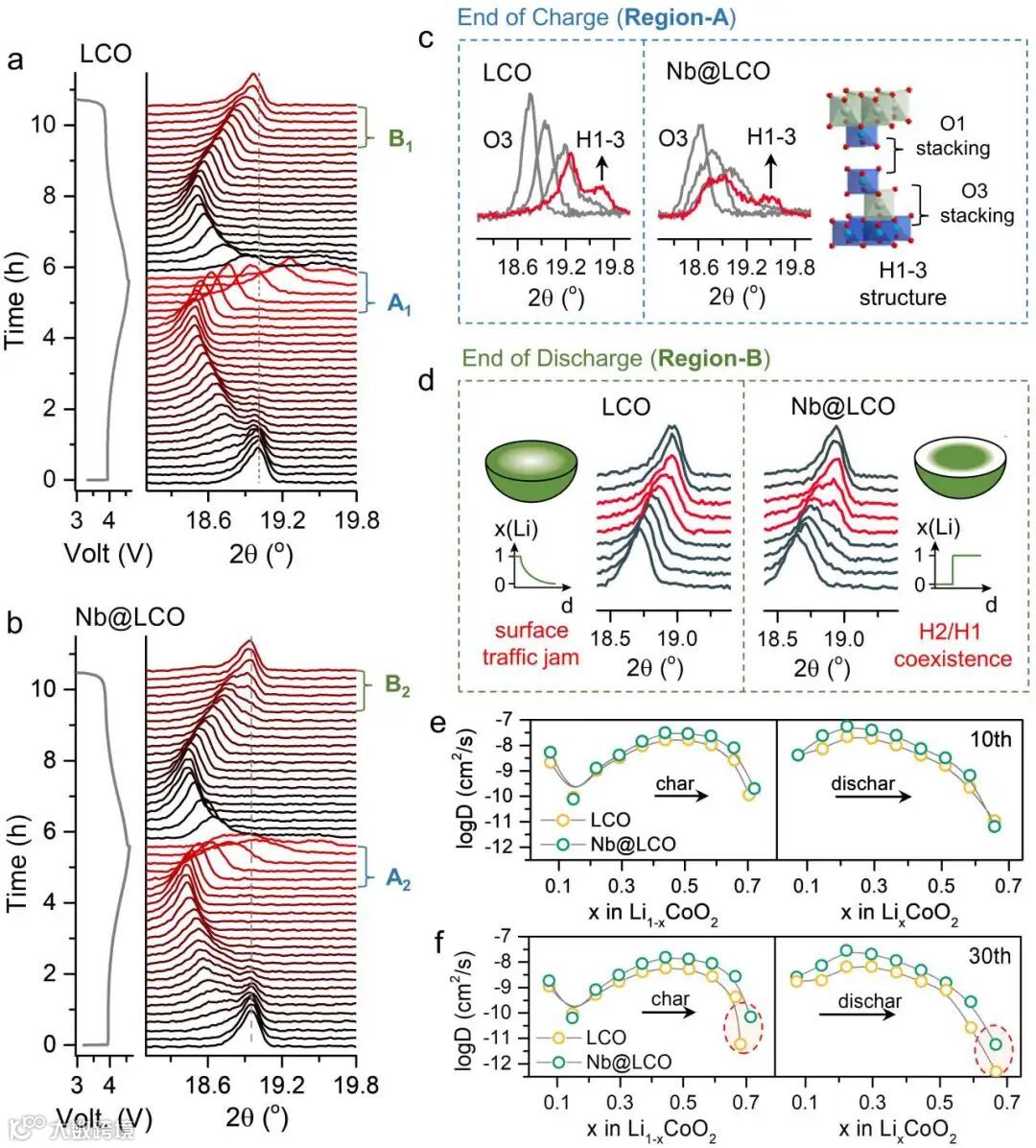 通过首圈原位XRD,作者发现(1)充电末端,Nb@LCO发生的H1-3相变更少,认为是占据在Li位的Nb在高脱Li态时起到支柱作用;(2)临近放电末端,Nb@LCO呈现贫Li/富Li(H2/H1)两相共存,提出假设:由于存在表面富集、逐渐渗透进体相的Nb梯度构型(且Nb占据Li位),因此Nb@LCO的表面Li空位会比体相少,结合Li的双空位迁移机制能垒更低,故嵌回的Li优先进入Nb@LCO颗粒内部,从而在放电时形成内部富Li相、外表贫Li相的两相共存,与普通LCO放电时易在表面形成“jammed near-surface region”不同,这种嵌Li模式具有更好的Li扩散动力学,由GITT也进行了验证。