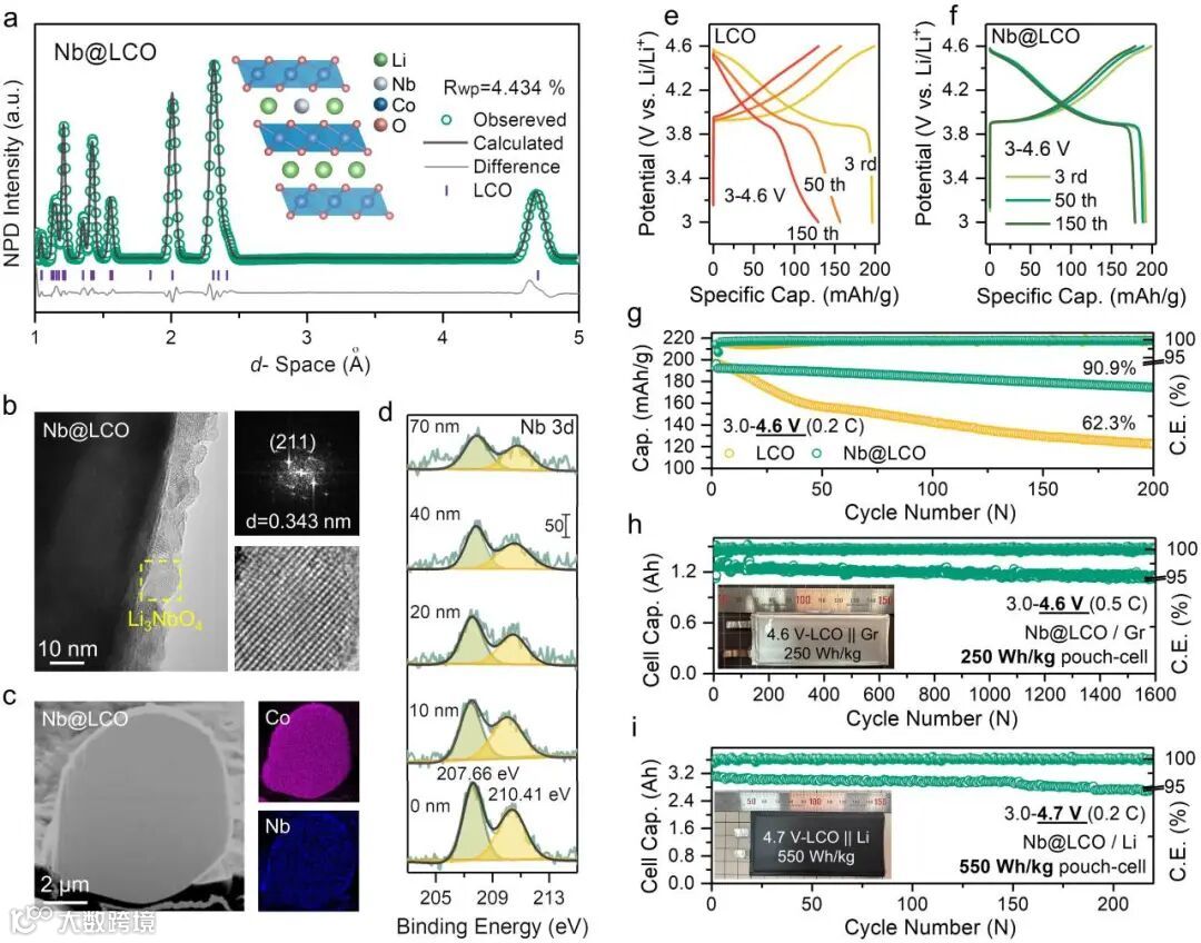 Figure 2. (a-d) Experimental evidence encompassing imaging techniques and spectroscopic analyses of Nb-modified LCO. (e-i) The electrochemical performance of LCO and Nb-modified LCO in coin-cell, pouch cell coupled with graphite and thin Li.