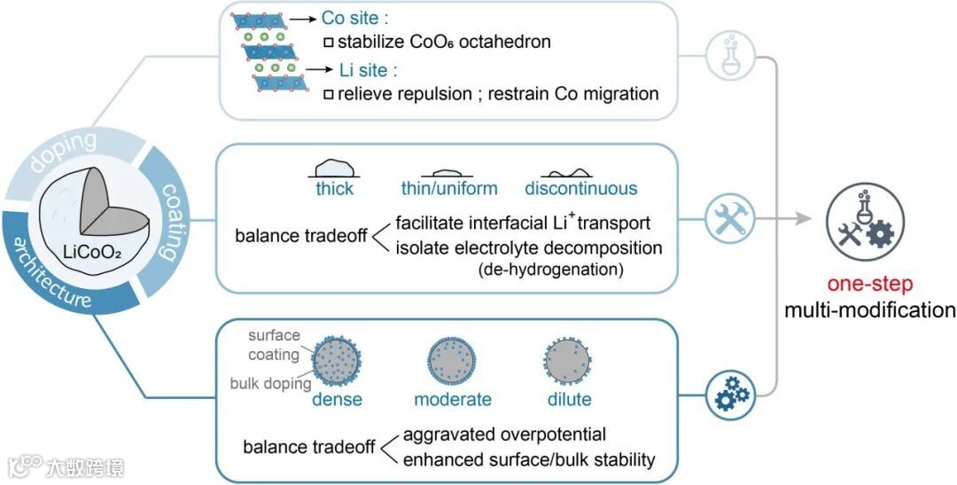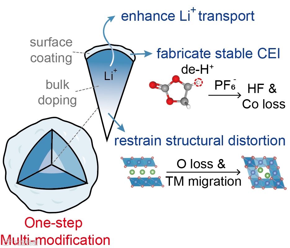 自钴酸锂(LCO)于1990年代首次商用化以来,学术界和工业界均在不断地致力于提升其充电截止电压以提高其能量密度。然而,高压时LCO脱出大量Li,常常伴随着表界面不稳定和体相结构畸变等问题。采用单一的传统改性策略(如掺杂或者包覆)无法全面解决上述不稳定性问题;且新型改性策略(如构筑梯度构型:高容量/活性中心+低容量/活性表面),难以通过简易的一步法合成来实现。基于此,迫切需要开发出一款可通过一步法实现多功能改性效果的策略,以稳定钴酸锂由表及里的高压不稳定性问题。