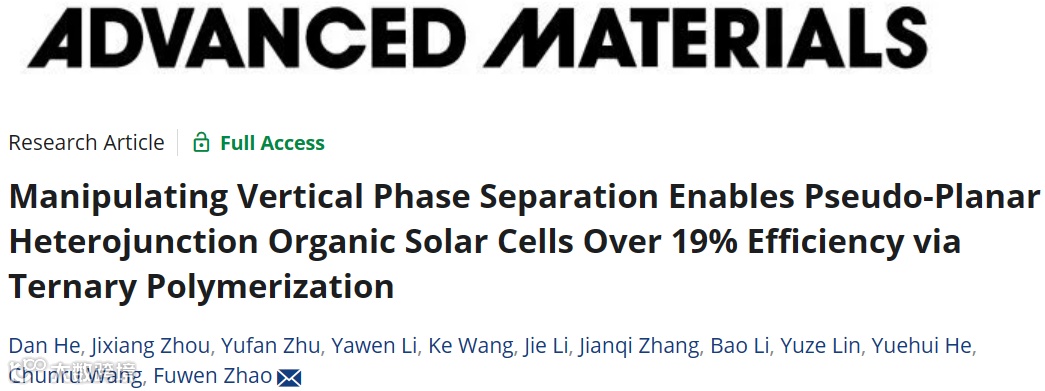 Manipulating Vertical Phase Separation Enables Pseudo-Planar Heterojunction Organic Solar Cells Over 19% Efficiency via Ternary Polymerization. Advanced Materials, 2023, https://onlinelibrary.wiley.com/doi/10.1002/adma.202308909