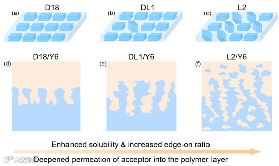 图1. 随着三元聚合物中DTP含量增加,给体性质以及聚合物/Y6受体PPHJ共混膜垂直相分离的变化规律。分子堆积示意图(a)D18,(b)DL1,(c)L2;PPHJ共混膜垂直相分离示意图(d)D18/Y6,(e) DL1/Y6, (f) L2/Y6. 图中蓝色区域为聚合物给体,红色区域为受体Y6。