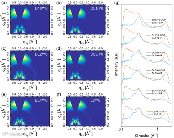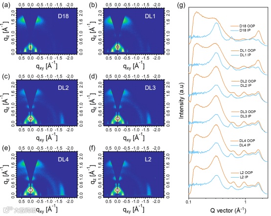 图3. (a) D18, (b) DL1, (c) DL2, (d) DL3, (e) DL4和(f) L2纯膜的2D GIWAXS图。(g)对应的沿面外(OOP)和面内(IP)方向的GIWAXS强度分布图。