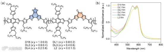 图2.(a) D18、DL1、DL2、DL3、DL4和L2的分子结构;(b) D18、DL1、DL2、DL3、DL4和L2纯膜的紫外-可见吸收光谱。
