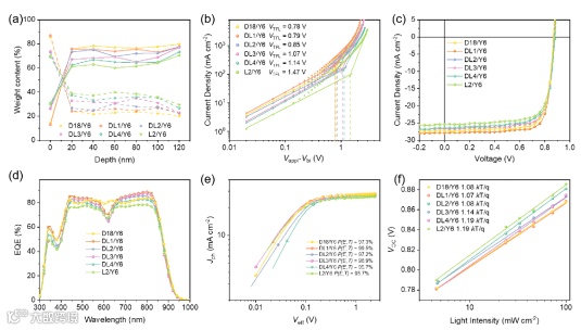 图5 (a) 聚合物/Y6 PPHJ共混膜在垂直方向不同深度处的聚合物(实线)和Y6(虚线)质量比。(b)基于聚合物/Y6 PPHJ共混膜的纯空穴器件的J- V曲线。(c)聚合物/Y6基PPHJ OSCs的J- V曲线和(d) EQE谱。(e)聚合物/Y6基PPHJ OSCs光电流密度与有效电压曲线。(f)聚合物/Y6基PPHJ器件VOC对光强的依赖性。