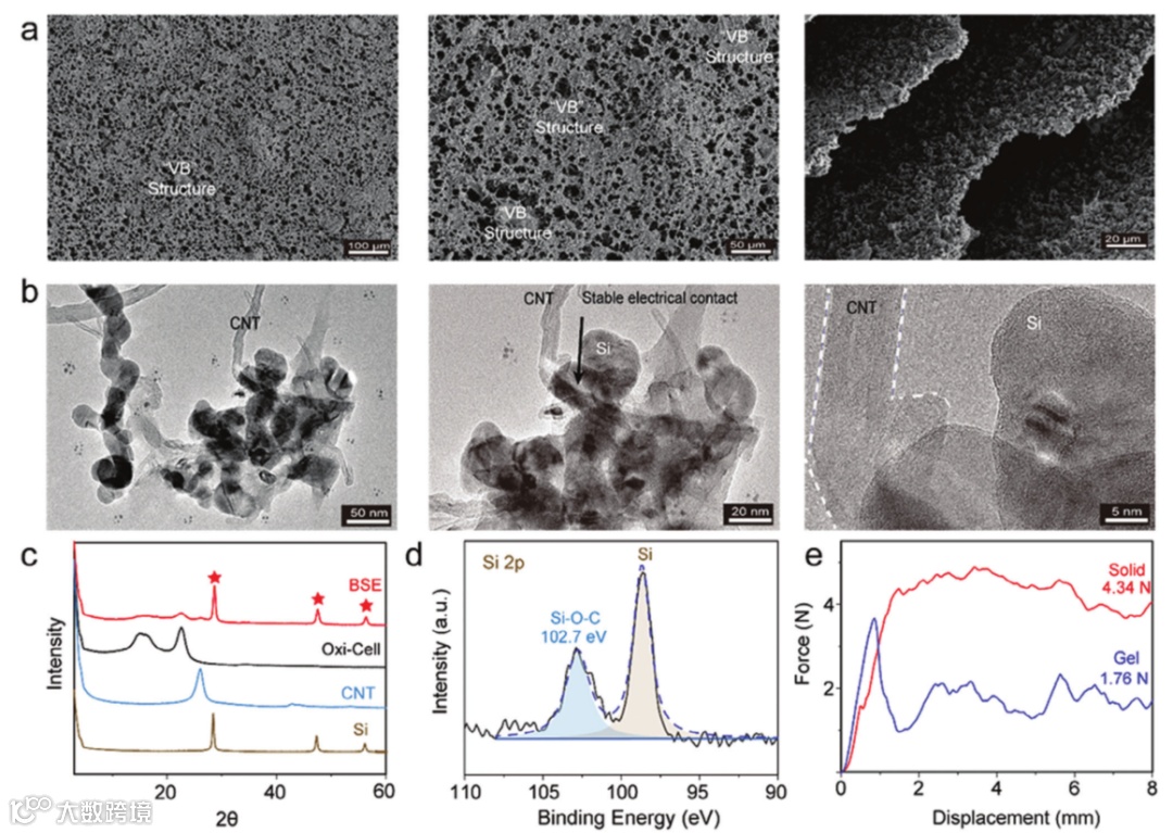 图2. 硅负极的微观结构图。硅负极的(a)SEM图像和(b TEM图像);(c)硅负极、氧化纤维素、CNT和硅的XRD图像;(d)硅负极的XPS图像;(e)剥离力图像。