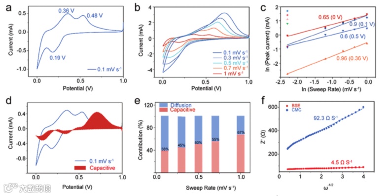 图4. 硅负极的电化学行为的动力学分析。(a)硅负极的CV曲线;(b)不同扫描速率下的CV曲线。(c)峰值电流密度和不同电位之间的关系。(d)CV曲线和相应扫描速率下的电容容量贡献。(e) 不同扫描速率下电容的贡献率。f) 在低频区域中Z’与𝜔 −1/2的关系。