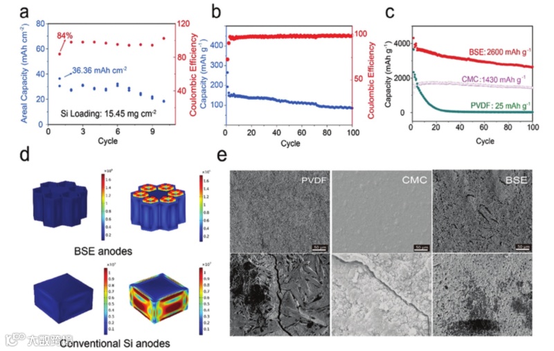 图5. 硅负极、PVDF和CMC电极的循环性能。(a)高容量硅负极循环性能;(b)以NCM523为正极的循环曲线图。(c)硅负极、PVDF和CMC电极的循环曲线。(d)力学有限元模拟结果图。(e)硅负极、PVDF和CMC电极在100个循环后的SEM图像。