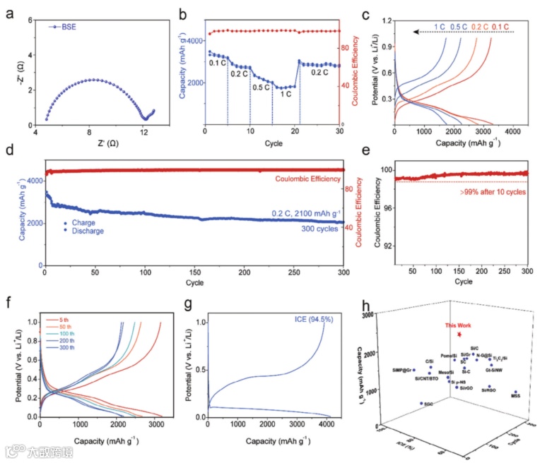 图3. 硅负极的电化学性能。(a)电化学阻抗谱(EIS);(b)倍率性能;(c)不同电流密度下的充/放电电压曲线;(d) 长循环性能曲线;(e)10次循环后电极的库仑效率;(f) 硅负极在5、50、100、200,以及300个循环后的充放电曲线图;(g) 首圈库仑效率曲线图;(h) 综合性能比较图像。