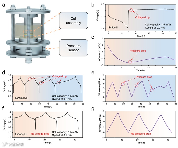 图 1. 带有压力测量系统的电池装配示意图以及不同阴极的 ASSLMB 的恒流循环与原位测量的电池压力变化。