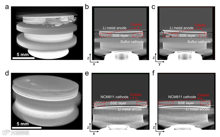 图 5.从三维(a)、xz(b)和 yz(c)视图对循环 S442-Li 电池进行的 X 射线计算机断层扫描(XCT)测量。从三维(a)、xz(e)和 yz(f)视图对循环 NCM811-Li 电池进行的 XCT 测量。多层电池结构已标注,SSE 裂纹用红色矩形框标记。