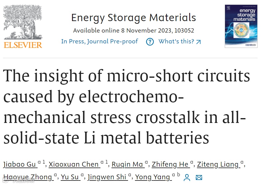 在全固态电池(ASSB)中使用锂金属负极(LMA)时,人们普遍观察到令人困惑的微短路行为。以往在 Li/Li 对称电池的研究中揭示了固体电解质(SSE)机械损伤的失效机制。然而,关于电极间的应力串扰及其对全电池微短路行为的影响的全面研究仍然缺乏。