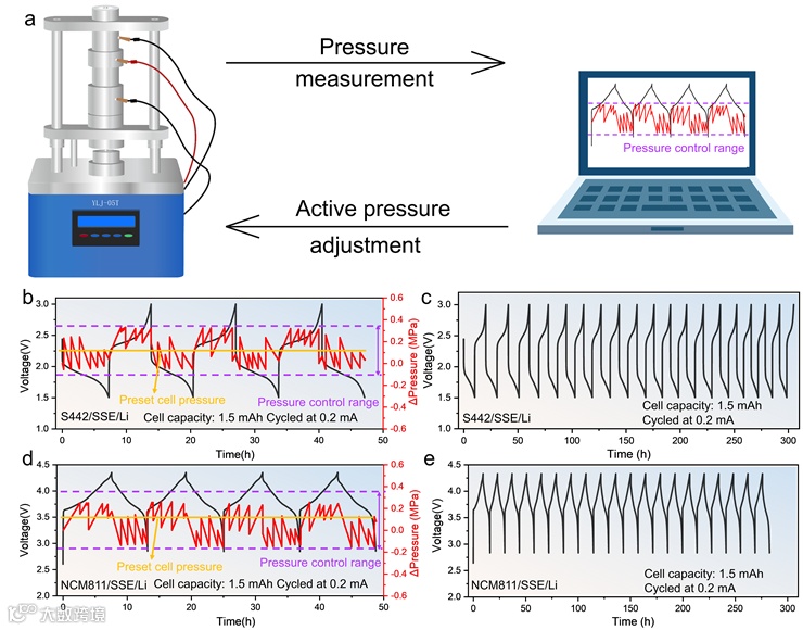 图 6. (a) 主动压力控制系统示意图。(b) S442-Li 电池的电化学曲线和压力调节结果。(c) 采用主动压力控制的 S442-Li 电池的循环数据。(d) NCM811-Li 电池的电化学曲线和压力调节结果。(e) 采用主动压力控制的 NCM811-Li 电池的循环数据。