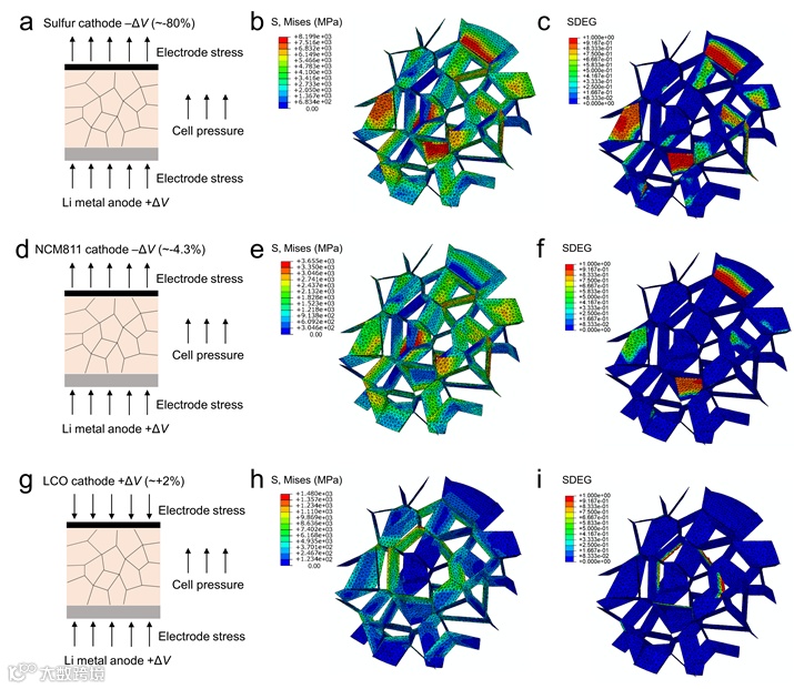 图 4.充电过程中电极应力变化、von Mises 应力以及随机多晶 SSE 晶界处内聚力单元的损伤演化(SDEG)比例分布示意图:(a-c)S442-Li 晶胞、(d-f)NCM811-Li 晶胞和(g-i)LCO-Li 晶胞。