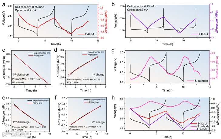 图 2. (a) 在 S442/Li 电池中的原位电化学和压力测试图。(b) LTO/Li 电池中的原位电化学和压力测试图。(c-f) LTO/Li 电池第一次(c 和 d)和第二次(e 和 f)放电和充电过程中测得的压力曲线的线性拟合。(g) 硫阴极的解耦压力变化曲线。(h) S442/Li 电池各电极的压力变化曲线。
