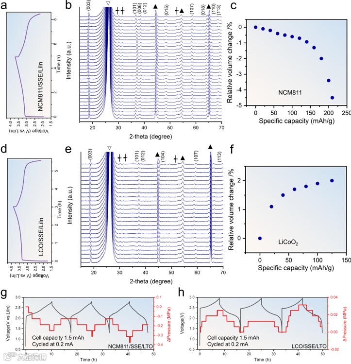 图 3:(a 和 b)NCM811-LiIn 纽扣电池第一个充放电周期的电化学曲线和原位 XRD 图。(c) NCM811 正极活性材料单位晶胞体积的相对变化。(d 和 e) LCO-LiIn 纽扣电池在第一个充放电循环期间的电化学曲线和原位XRD 图谱。(f) LCO 阴极活性材料单位晶胞体积的相对变化。NCM811/LTO 电池(g)和 LCO-LTO 电池(h)的恒流循环与原位电池压力变化。