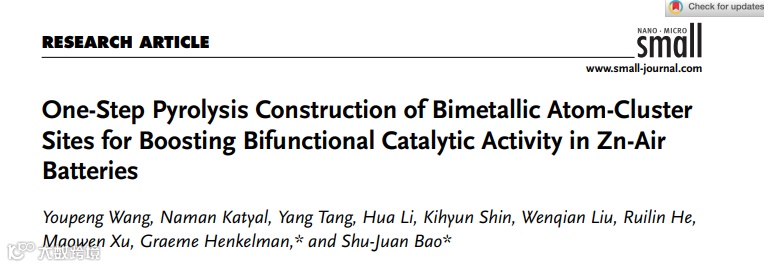 近日,来自西南大学的包淑娟教授与德克萨斯大学奥斯汀分校的Graeme Henkelman教授合作在国际知名期刊Small上发表题为“One-Step Pyrolysis Construction of Bimetallic Atom-Cluster Sites for Boosting Bifunctional Catalytic Activity in Zn-Air Batteries”的文章。该文章开发了一种简易的亚纳米催化剂的制备方法,通过该方法制备的FeNi原子-团簇催化剂展现出超高的ORR和OER双功能催化活性,实验结果和模拟计算证实Fe和Ni之间的协同作用是提高其催化性能的关键。此外,由该催化剂组装的锌-空气电池展现出达1000h的超长稳定性。