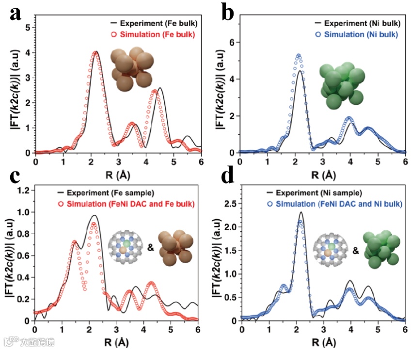 HADDF-STEM分析表明所制备的催化剂中单原子与团簇共存,且团簇主要分布在0.8nm左右;计算模拟的结构与真实催化剂的成键空间结构较符合,证实了Fe,Ni金属原子-团簇共存的状态和所建计算模型的合理性。