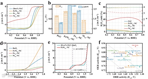 得益于氮配位下的Fe和Ni的协同作用,在0.1M KOH中,催化剂表现出优异的4电子ORR性能,半波电位达0.936V,且其OER性能与商业化RuO2相当。ΔE(Ej=10mA-E1/2)等于0.594V。