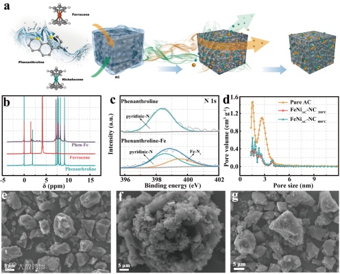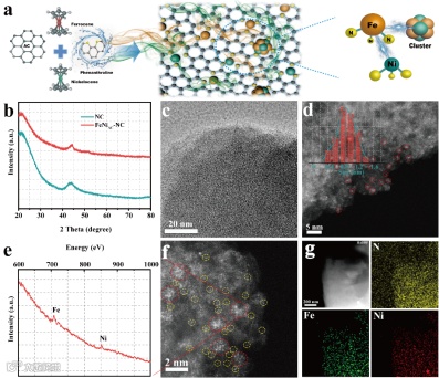 利用含氮小分子1,10-菲洛啉在一定温度下会液化和二茂金属盐易挥发的特点,将富含多孔结构的活性炭与菲洛啉,二茂铁,二茂镍直接均匀混合后氩气氛围下800℃退火,冷却后得到。在退火过程中,液态的菲洛啉与气态的二茂金属盐配位,形成与酞菁铁类似结构,同时进入活性炭各个孔道内,进一步碳化后便得到氮配位的双金属原子-团簇催化剂。我们对该方法的可行性进行了深入探讨,并发现此方法可以进一步扩展到FeNi,FeCo,CoNi等其他单金属或多金属的亚纳米催化剂的制备。