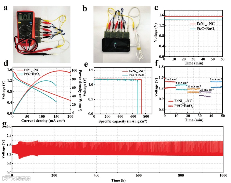 针对阴极的问题,这篇文章选取廉价过渡金属Fe和Ni,利用含氮小分子1,10-菲洛啉在一定温度下液化和二茂金属盐易挥发的特点,将富含多孔结构的活性炭与菲洛啉,二茂铁,二茂镍直接均匀混合后氩气氛围下800℃退火,一步得到均匀碳负载Fe-Ni原子和团簇共存的双功能催化剂FeNiAC-NC,该催化剂具有较高的ORR活性(E1/2 = 0.936 V vs RHE)和较小的ORR/OER电位差(仅为0.594 V)。使用FeNiAC-NC催化剂组装的锌空气电池,稳定运行1000小时依然稳定。