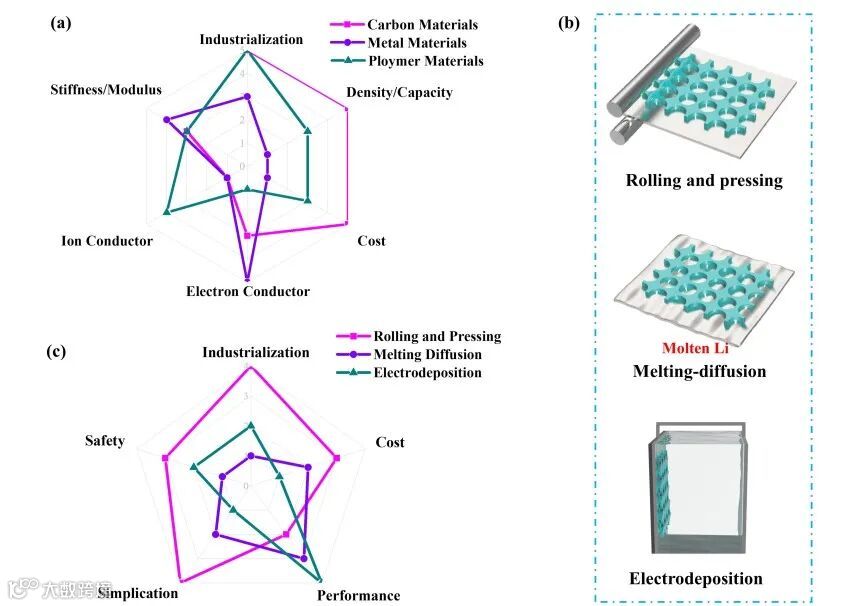 图 5. (a) 三维框架/宿主材质的优劣势对比分析雷达图。(b) 基于框架/宿主的复合锂负极的三种制备方法及其 (c) 优劣势对比分析雷达图。