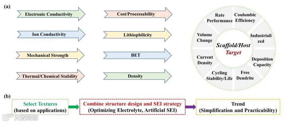 图 6. (a) 框架/宿主的物化性质对其电化学性能影响的示意图。(b) 锂金属复合负极的三维框架/宿主材料的设计与选用准则及其展望。