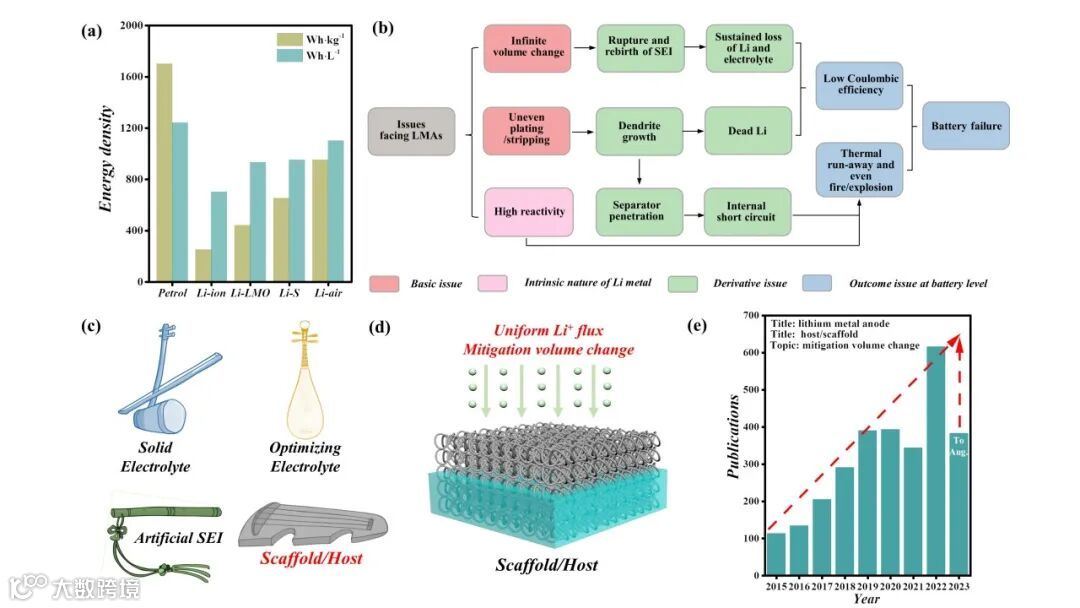 图1. (a) 汽油和典型锂离子或锂金属基电池的能量密度对比分析图。(b) 锂金属负极由于巨大体积形变、不均匀性沉积和高反应活性所引起的低库伦效率、热失效甚至起火/爆炸等挑战。(c) 锂金属负极常见的保护策略。(d) 三维框架/宿主策略在锂金属负极中的应用。(e) 与锂金属负极三维框架/宿主策略相关的工作论文发表趋势图。