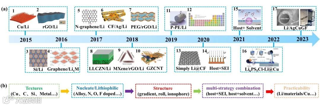 对框架/宿主材料的历史与最新进展进行了简要概述。框架/宿主材料的发展史可总结为五个阶段,即材质选择阶段、亲锂修饰阶段、结构设计阶段、多策略组合阶段与简易化实用阶段,并对每一阶段首次报道的最为经典的框架/宿主材料进行举例介绍,如图3所示。