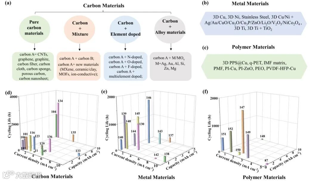 选用与设计框架/宿主材料的应遵循的准则如图6b所示。(1)首先,在选择框架/宿主材料材质时,必须考虑其应用。对于全固态电池应用而言,聚合物基框架/宿主由于其优良的离子导电性是首选。除固态电池外,碳材料基框架/宿主可能是优先选择,因为其未来发展潜力巨大,正如图5a所示。(2)应当多策略组合。考虑到锂离子流沉积的复杂性,用单一的框架/宿主策略难以完全克服枝晶生长,而结构设计是一种有效且便捷的枝晶抑制策略,应当与优化电解质策略或人工SEI策略相结合,以产生1+1 > 2效应。(3)应简化框架/宿主与复合负极的制备工艺,降低制备成本,以满足未来的实际应用需求。用于框架/主体的原材料以及调控亲锂性的合金元素或掺杂元素也应廉价易得。