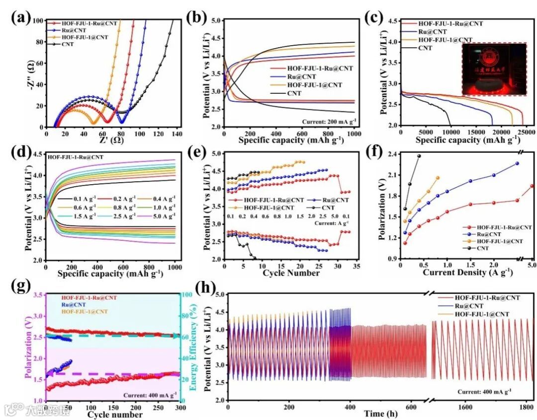 图3 (a)电化学阻抗谱;(b)在200 mA g−1下的限容测试;(c) 100 mA g−1的完全放电曲线;(d) HOF-FJU-1-Ru@CNT电池在不同电流密度下的限容放电曲线;(e)倍率能力测试;(f)不同电流密度下的过电位情况;(g)循环过程中的能量效率和极化电压;(h)循环稳定性测试。