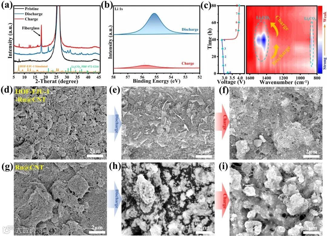图4 (a) XRD谱图;(b) Li 1s的XPS谱图;(c)充放电过程的FTIR谱图;(d-f) HOF-FJU-1-Ru@CNT和(g-i) Ru@CNT充放电过程中的SEM图。