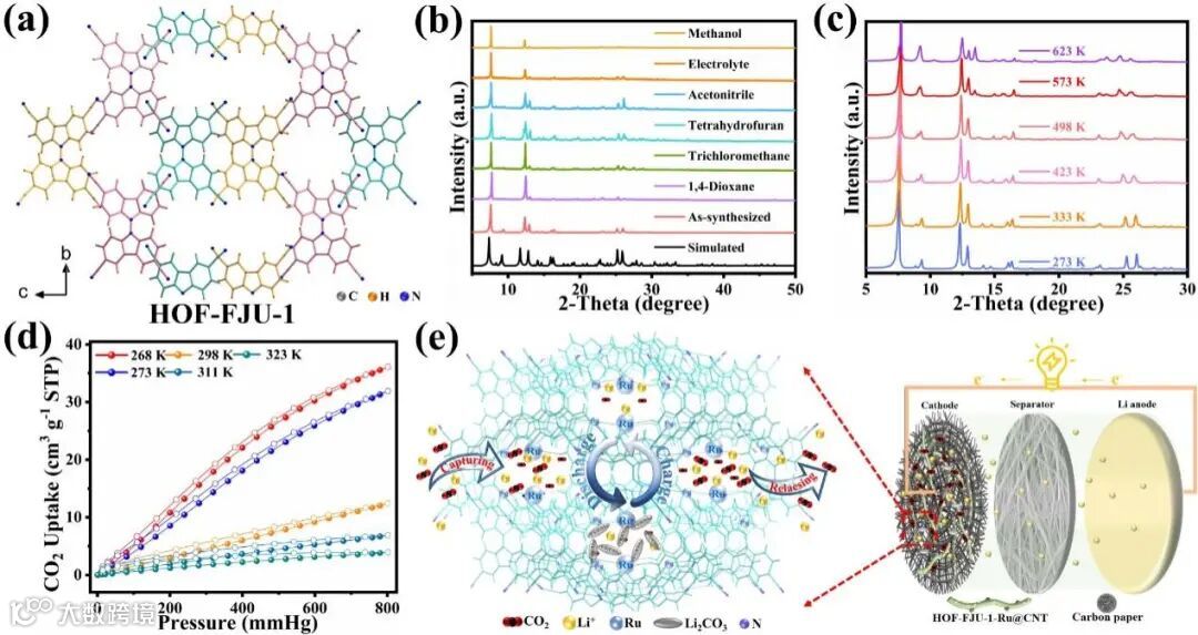 图1 (a) HOF-FJU-1的晶体结构;(b)溶剂稳定性测试;(c)热稳定性测试和(d) CO2吸附测试;(e) 所组装的锂二氧化碳电池示意图。