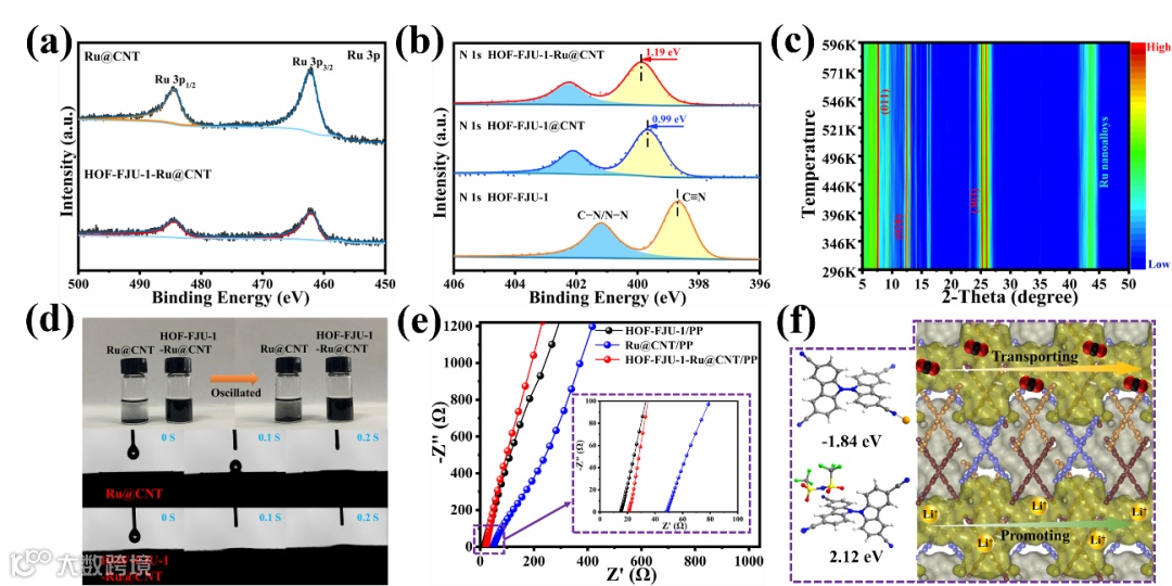 图2 (a) Ru 3p和(b) N 1s 的XPS光谱;(c) HOF-FJU-1-Ru@CNT在不同温度下的XRD图谱;(d) Ru@CNT和HOF-FJU-1-Ru@CNT的溶剂分散性测试和电解液润湿能力测试;(e)锂离子传输能力测试;(f) Li+和TFSI -与HOF-FJU-1的结合能计算。