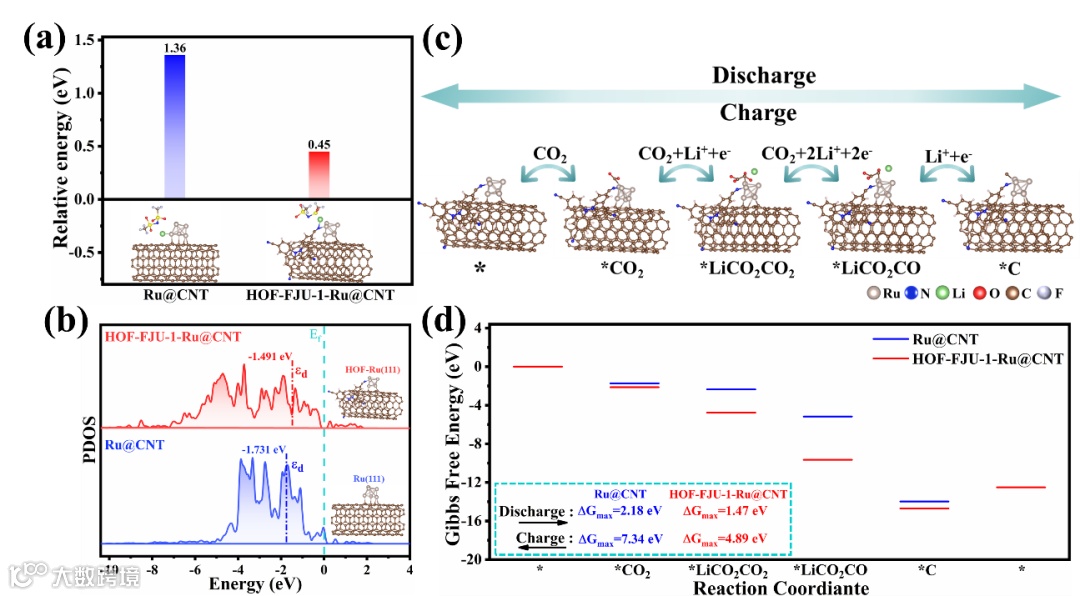要点二:含氰基官能团的多孔HOF-FJU-1能诱导放电产物均匀沉积,并能一定程度上缓解充放电过程中的体积膨胀。此外HOF-FJU-1能使钌的d带发生正移,并显著降低碳酸锂形成/分解过程中的反应能垒,形成均匀的高效催化位点。