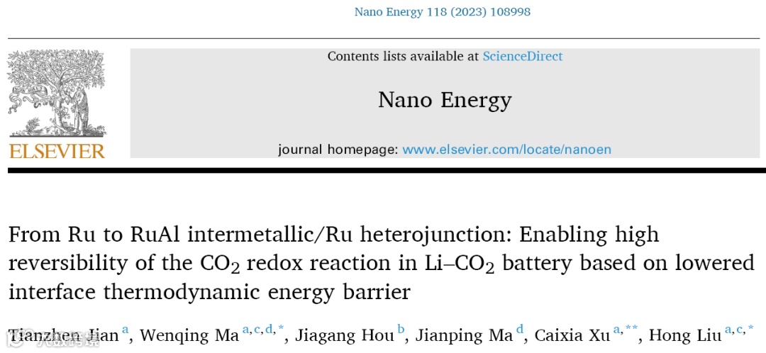近日,济南大学刘宏教授&徐彩霞教授&马文庆副教授团队,在国际知名期刊Nano Energy上发表题为“From Ru to RuAl intermetallic/Ru heterojunction:enabling high reversibility of the CO2 redoxreaction in Li–CO2 battery based on lowered interface thermodynamic energy barrier”的研究论文。该论文分析了锂–二氧化碳电池目前面临的挑战,提出了利用可调控的脱合金化驱动相和结构重构的策略,构筑了互穿相多级多孔RuAl/Ru异质结(NP-RuAl/Ru),显著提高了Ru的本征催化活性和耐久性。