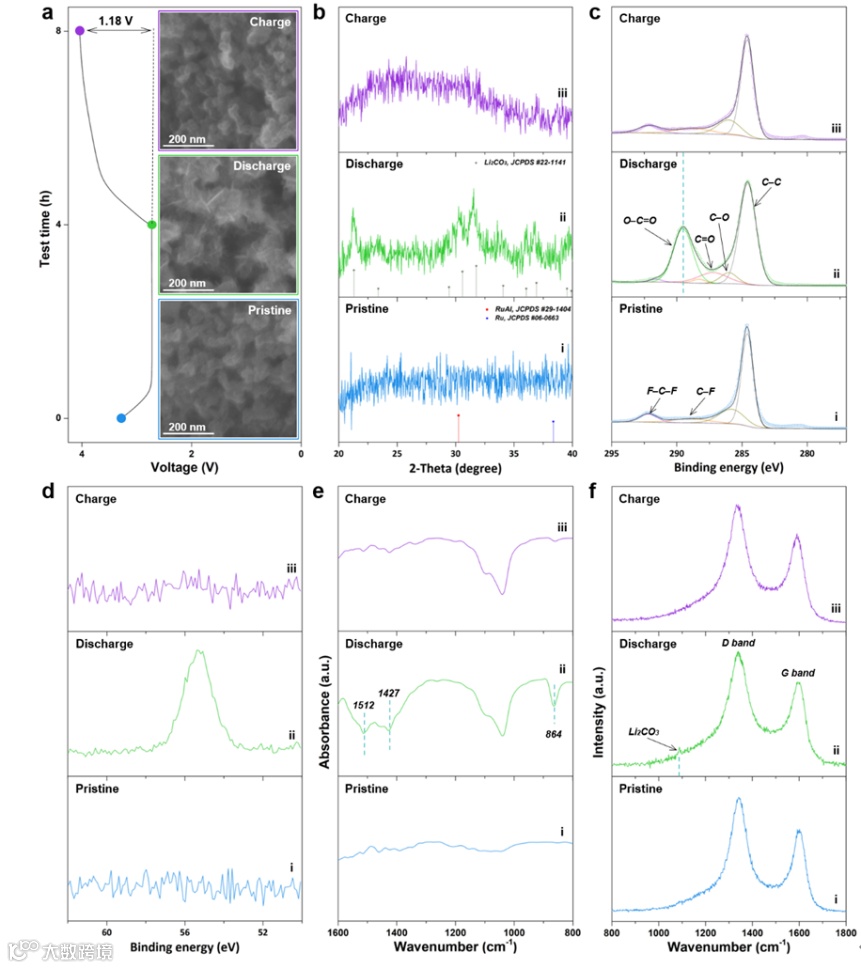 图4. CO2电化学氧化还原反应的表征(a) KB/NP-RuAl/Ru电极的首次充放电曲线和(内插图)不同充放电状态的SEM图、 (b) XRD衍射花样、(c, d) C 1s和Li 1s XPS谱图、(e)FTIR和(f)Raman光谱图。