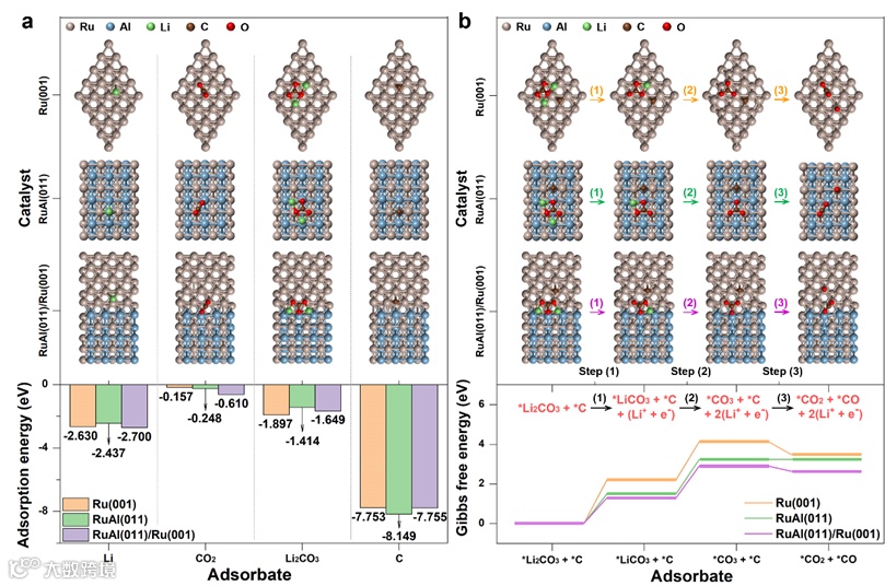 作者采用DFT计算研究了RuAl(011)/Ru(001)异质结、RuAl(011)和Ru(001)模型对不同反应物和产物的吸附。如图6a,三种模型均对Li表现出适度吸附,表明它们可以有效地为CO2还原反应供给Li。对于CO2还原反应,CO2的强吸附是实现其捕获和活化的必要条件。得益于Al的掺入,RuAl/Ru异质结具有丰富的纳米异质界面,从而增加了高活性的催化位点,并驱动电荷在异质结构中重新分布,增强了对CO2的吸附。此外,RuAl/Ru异质结对Li2CO3表现出明显的高吸附能,有利于Li2CO3在正极催化剂上均匀沉积。对于CO2析出反应,具有较高结合能的Li−O键的断裂对Li2CO3的分解至关重要。与Li+解离相关的前两个中间步骤中,RuAl(011)表现出相较于Ru(001)更低的ΔG。RuAl(011)/Ru(001)异质结可进一步降低与Li+解离相关的中间步骤的ΔG。此外,与RuAl(011)相比,RuAl(011)/Ru(001)在从*CO3和*C转化为*CO2和*CO的中间步中表现出更低的ΔG(图6b)。这些结果表明,RuAl/Ru可以降低Li2CO3和C共分解反应的热力学势垒,从而显著提高CO2析出反应的本征催化活性。
