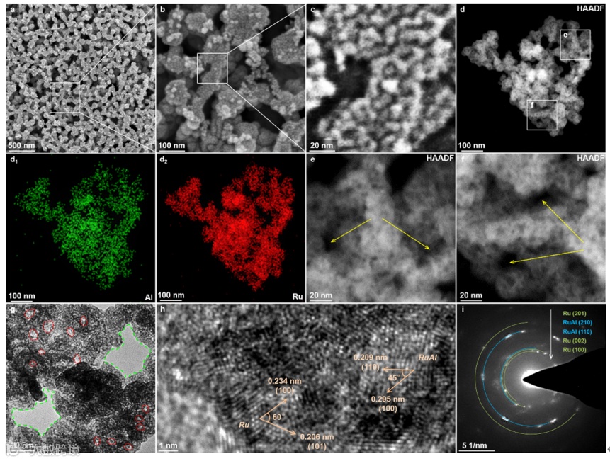 图2. NP-RuAl/Ru的形貌和结构。(a-c) SEM、(d-f) HAADF-STEM、(g) TEM、(h) HRTEM图,以及(i) SAED。(d1, d2) 是对应于(d)的EDS元素分布图。(e,f)中黄色箭头所指为二级介孔。