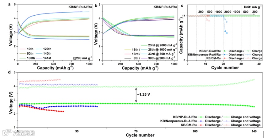 图5. 基于NP-RuAl/Ru、Nonporous-RuAl/Ru、CM-Ru三种电催化剂构筑的Li–CO2电池电化学性能的对比研究。KB/NP-RuAl/Ru电极在(a) 200 mA g-1和(b)不同电流密度下的充放电曲线。(c)电池在不同电流密度下循环时的容量演化和(d)在200 mA g-1下循环时的放电/充电终止电压演化。