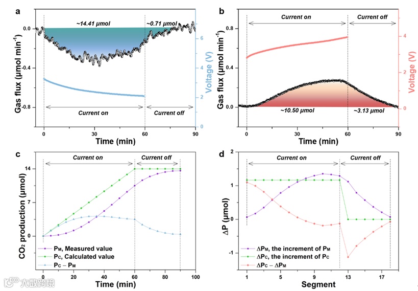 图7. KB/NP-RuAl/Ru电池(a)放电和(b)充电过程中的原位DEMS结果。CO2的释放过程被人为地分成若干时间长度为5分钟的片段,以深入分析气体的析出过程。(c)实验测得的CO2产量(PM)和理论CO2产量(PC)的演化曲线;(d)∆PC和∆PM的演化曲线。∆PC和∆PM分别为每段PC和PM的每段增量。